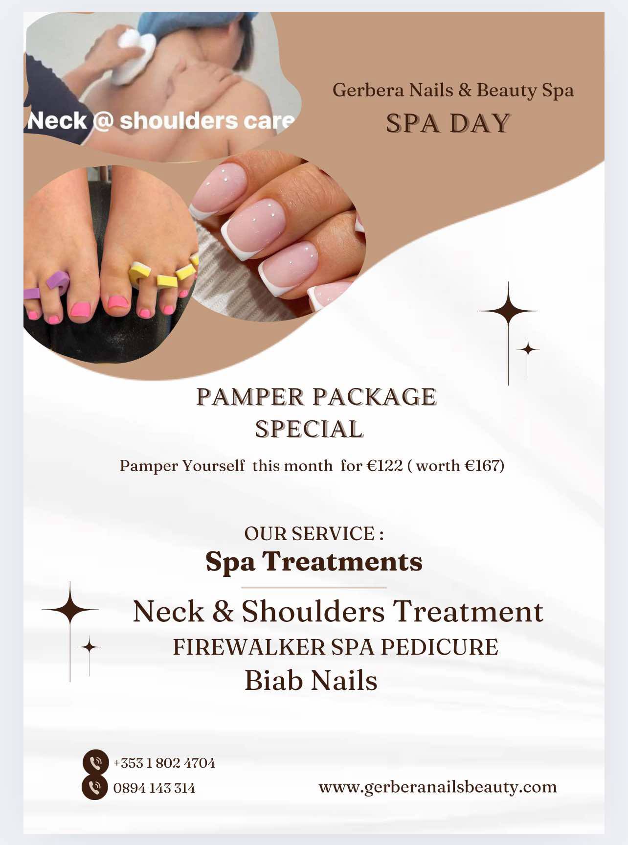 Using luxury natural products, feet soak in warm water- a combination of 27 herbs creates an optimal environment for a smoothing and relaxing bathing experience while conditioning and naturing the skin. Exfoliation, hard skin remove, file, shape, massage. *** shellac add on €10*** |